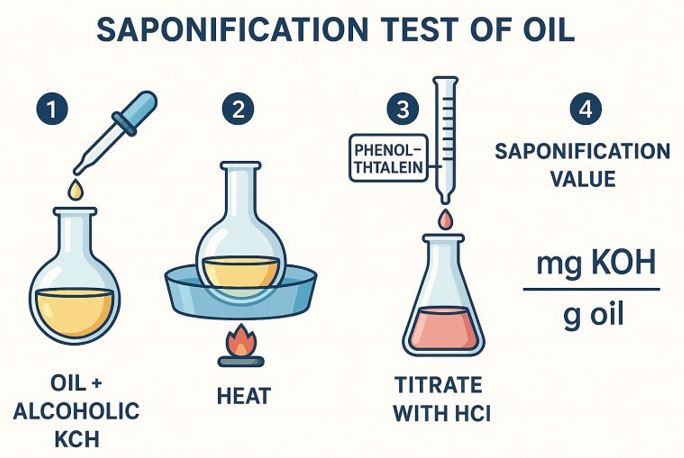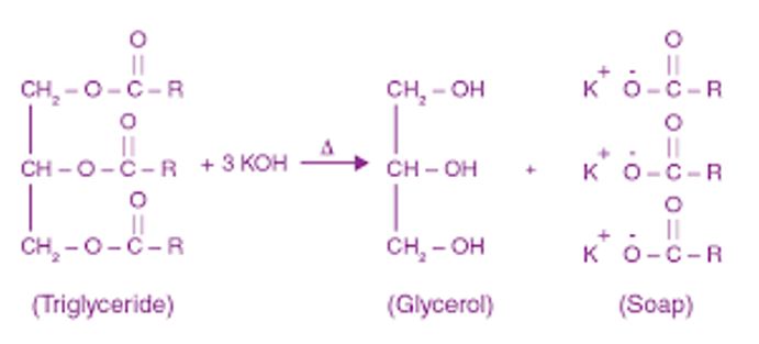 اگر به مقدار معینی از ماده چرب مقدار زیادتر از حد پتاس الکلی اضافه شود و حرارت داده شود، در عین حال که تحت دستگاه سرد کننده قرار گرفته باشد، سبب صابونی شدن ماده چرب می گردد. محلول الکلی برای حل کردن چربی و زیاد کردن سطح تماس ماده چرب با پتاس می باشد.