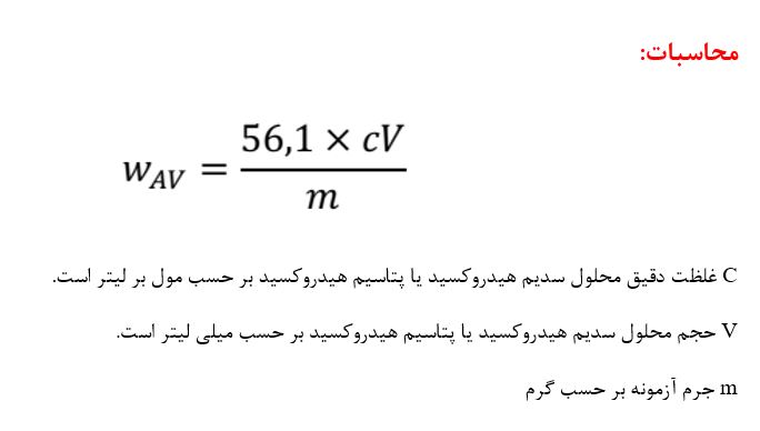 نمونه در مخلوط حلال مناسب حل شده و اسیدهای موجود با محلول اتانولی یا متانولی سدیم هیدروکسید یا پتاسیم هیدروکسید عیار سنجی می¬شود.
