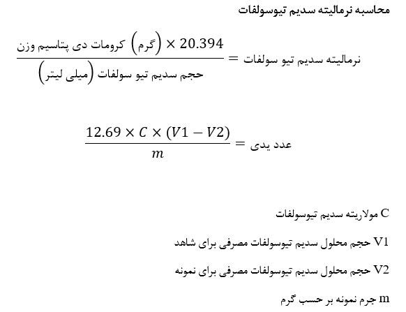 ۳- ۰.۲ تا ۲.۳ گرم پتاسیم دی کرومات خشک را وزن کرده و در ارلن قرار دهیم.